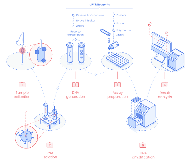 Virus cDNA is then amplified by PCR cycles. Genetic material amplification is recorded by measuring the fluorescence intensity generated by the qPCR Probe. The more the amount of target cDNA is present, the stronger the fluorescent signal becomes.