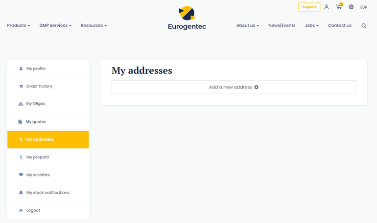 Simply add a new address by clicking on the “Add a new address” option. You have now to fill all the requested fields and save your address. Tick the box “default” if you want to preselect this address for your future order. In the “Address type” field, don’t forget to precise if this new address is a billing, a delivery address, or both.