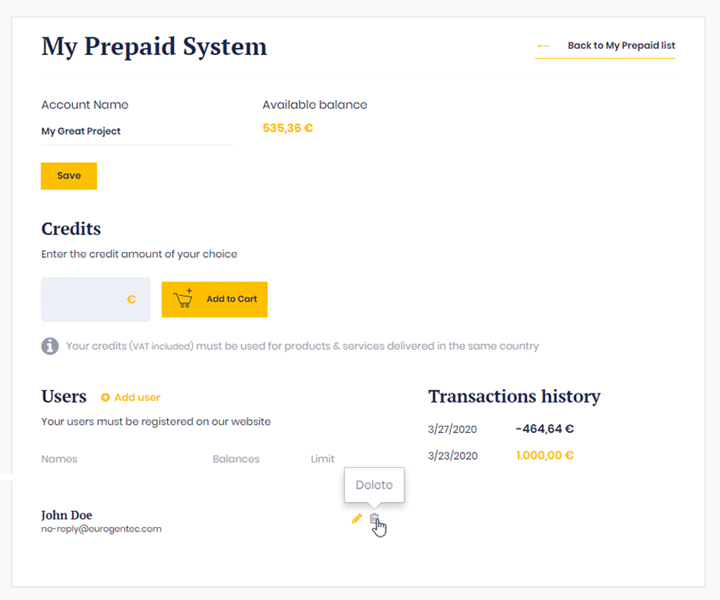 Once your prepaid account will be created, you can add one or more users and grant them a certain limit to your credit or let them use the whole credit.