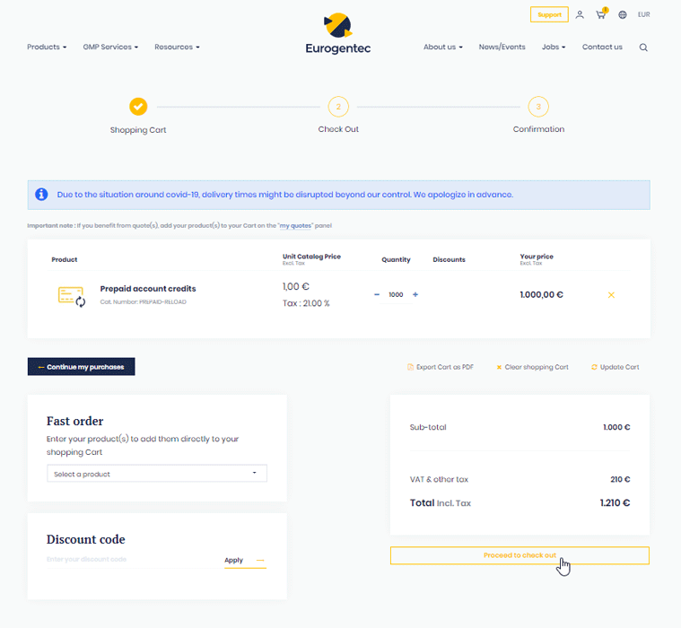Please note that the credit will be added to your balance only after Eurogentec received your payment.