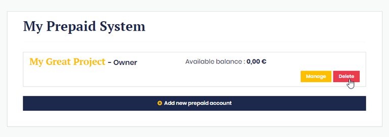To delete an existing prepaid account, click on the “Delete” button.