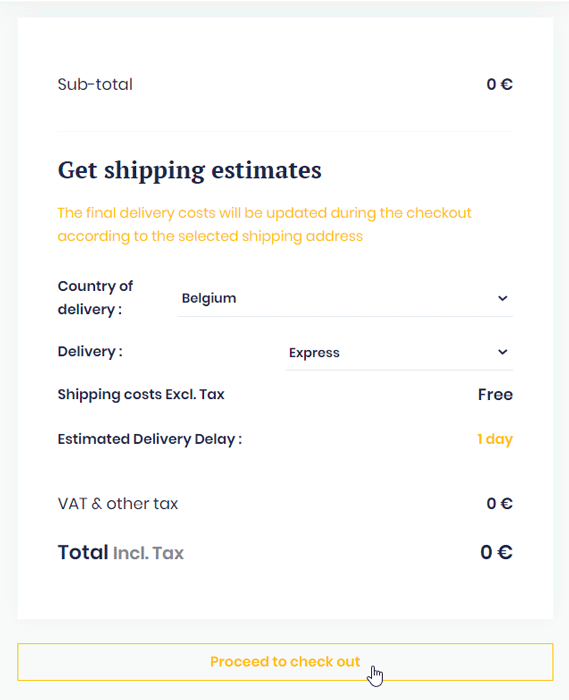 The final delivery costs will be updated during the checkout according to the selected delivery address.