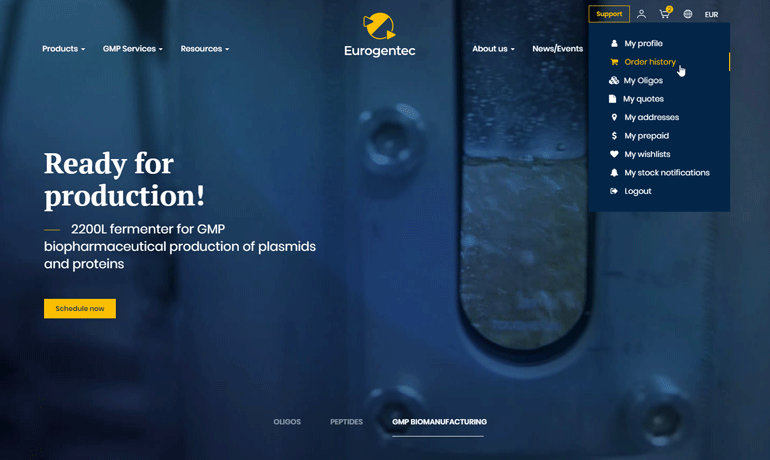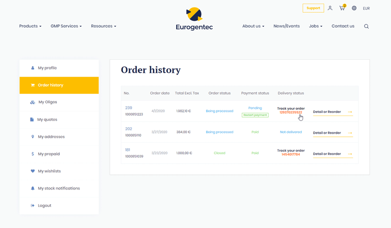 To track your order status, go to your account area by putting your mouse over the person icon in the main navigation menu, and click on the “Order history” button.