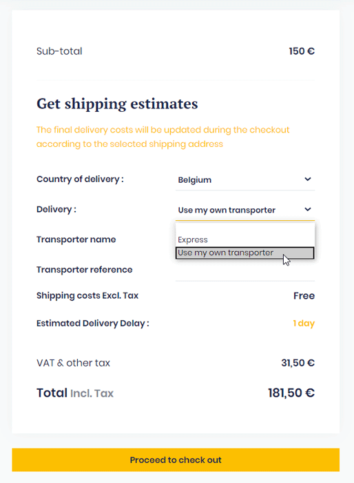 The “Express Delivery” option is automatically selected but, if you wish, you can also use your own transporter (please refer to the next question of this FAQ).