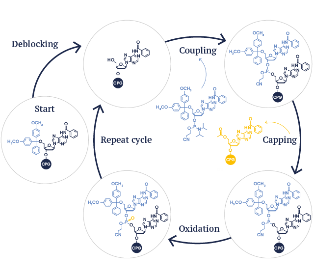 During DNA synthesis, each nucleotide is coupled sequentially (from 3’ to 5’) to the growing chain according to the standard ß-cyanoethyl chemical reactions.