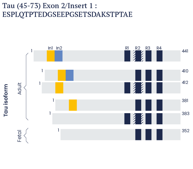 Shown beside is a schematic representation of Tau Peptide (45-73). This is a 29-amino acid long peptide derived from the Exon 2/Insert 1 domain.